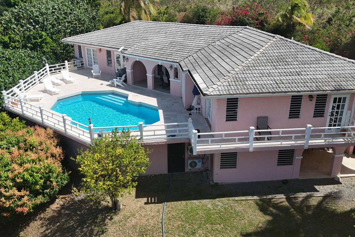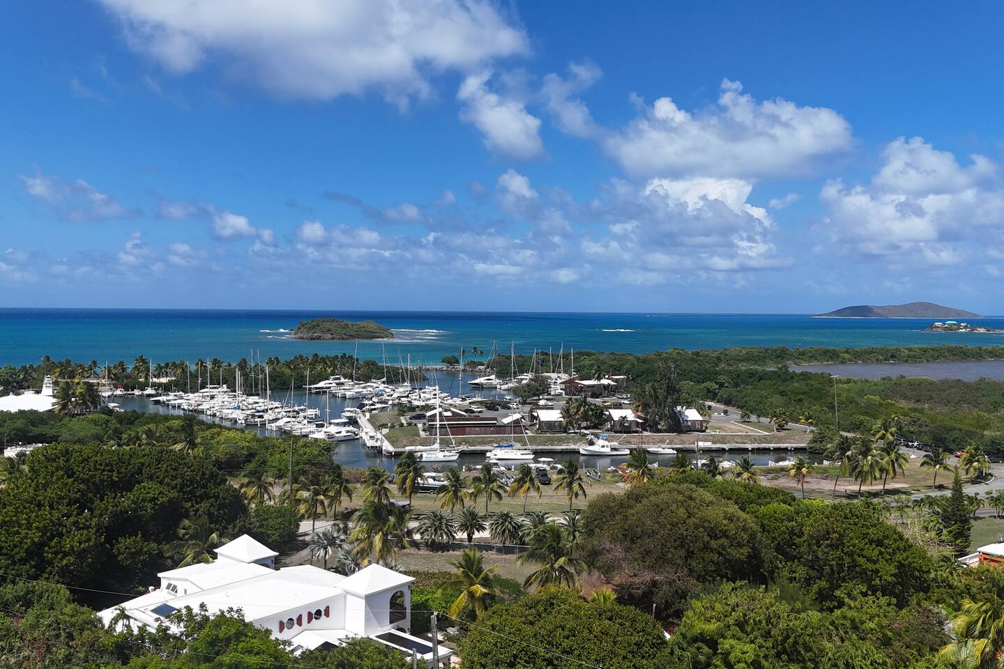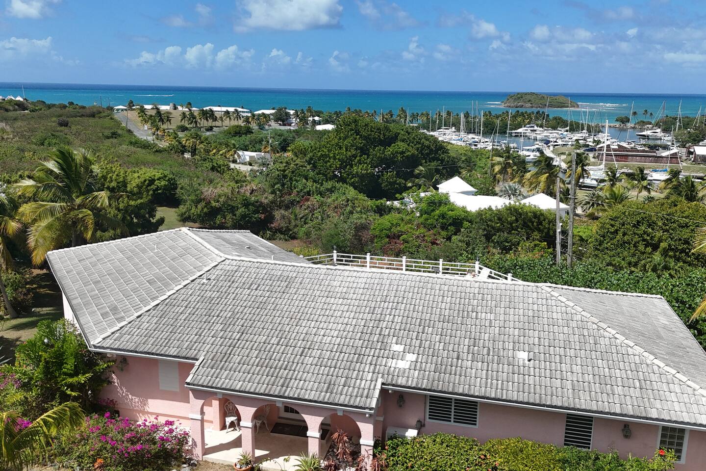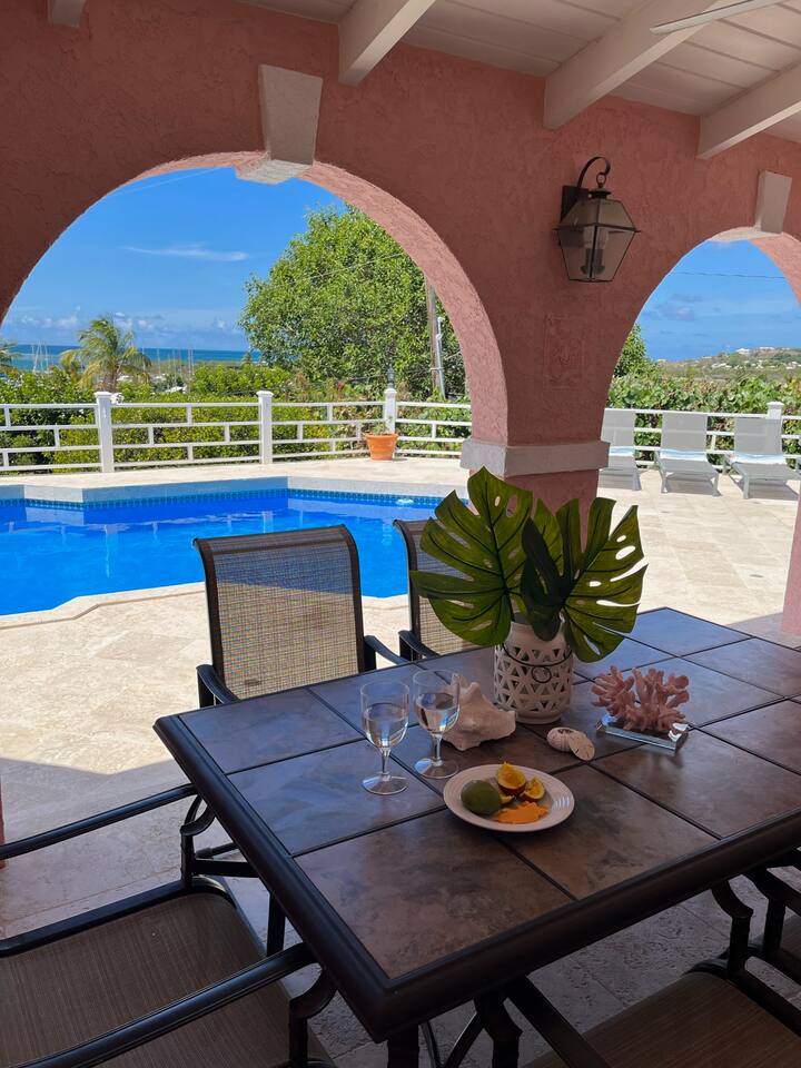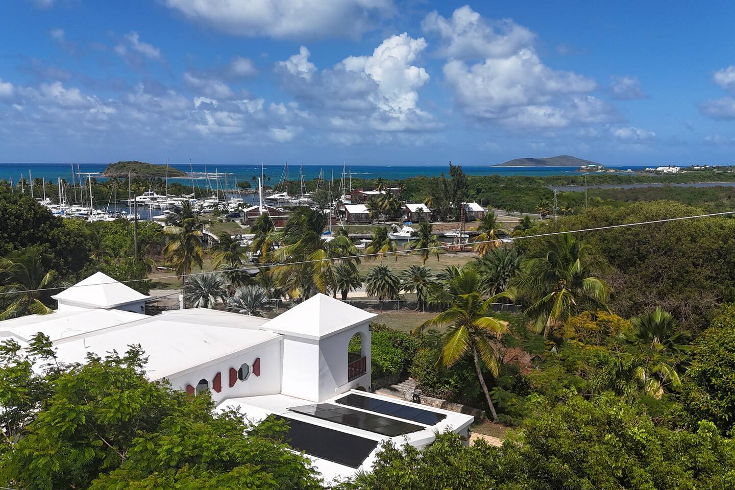 Beautiful private residence with 5 ensuite bedrooms (includes optional lower level apartment) entire house is fully air conditioned and all rooms have interior access. Magnificent views of Green Cay marina out to Buck Island. Well equipped for friends or families with small children. Located next to Buccaneer resort and golf course in gated Shoys Beach neighborhood with access to Shoys Beach. House is equipped with beach gear, gourmet kitchen, and remote office.