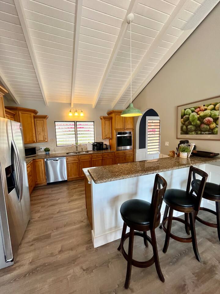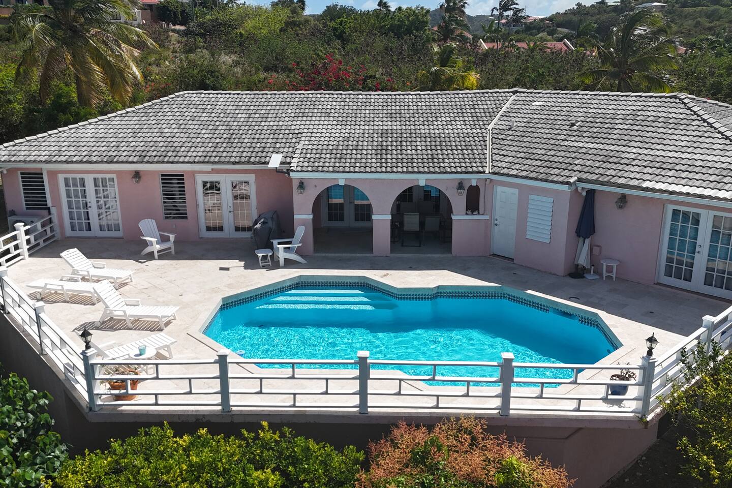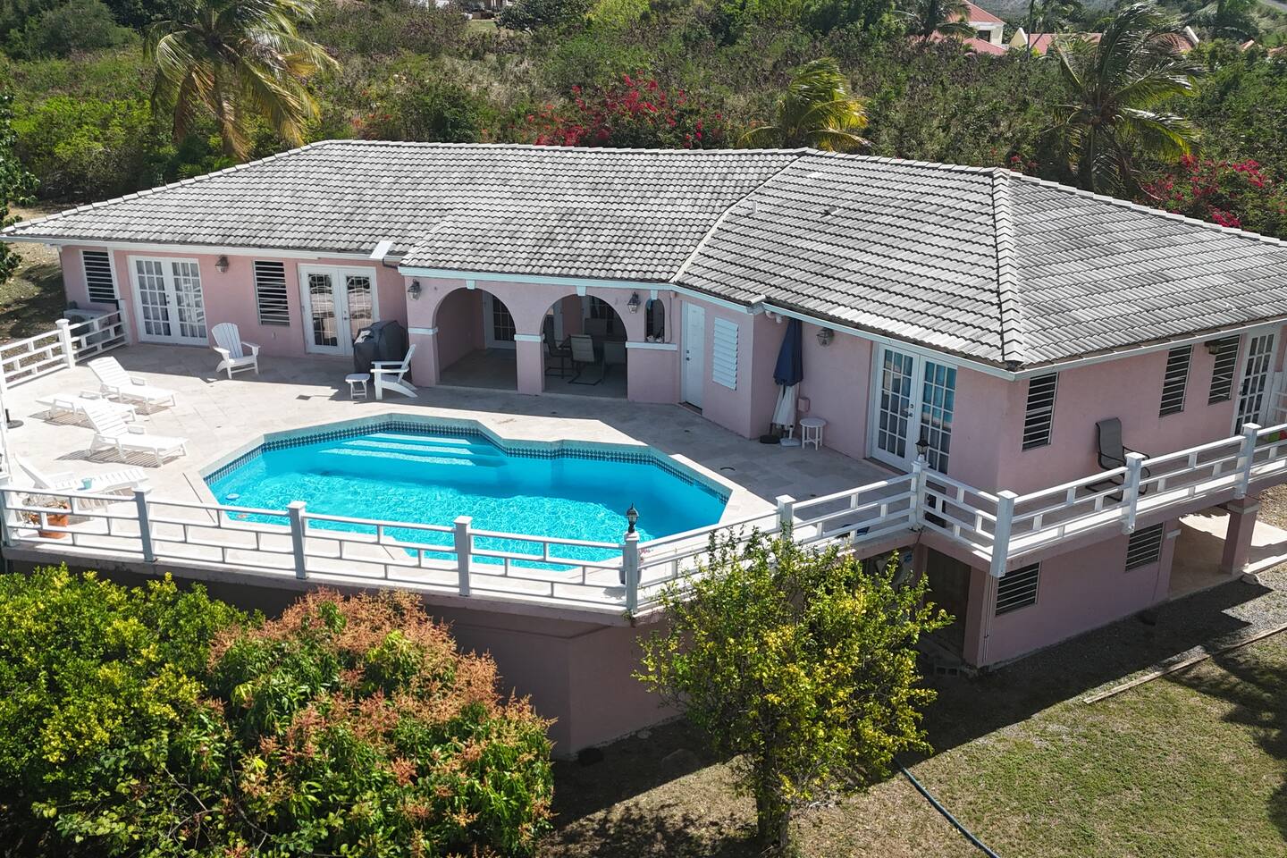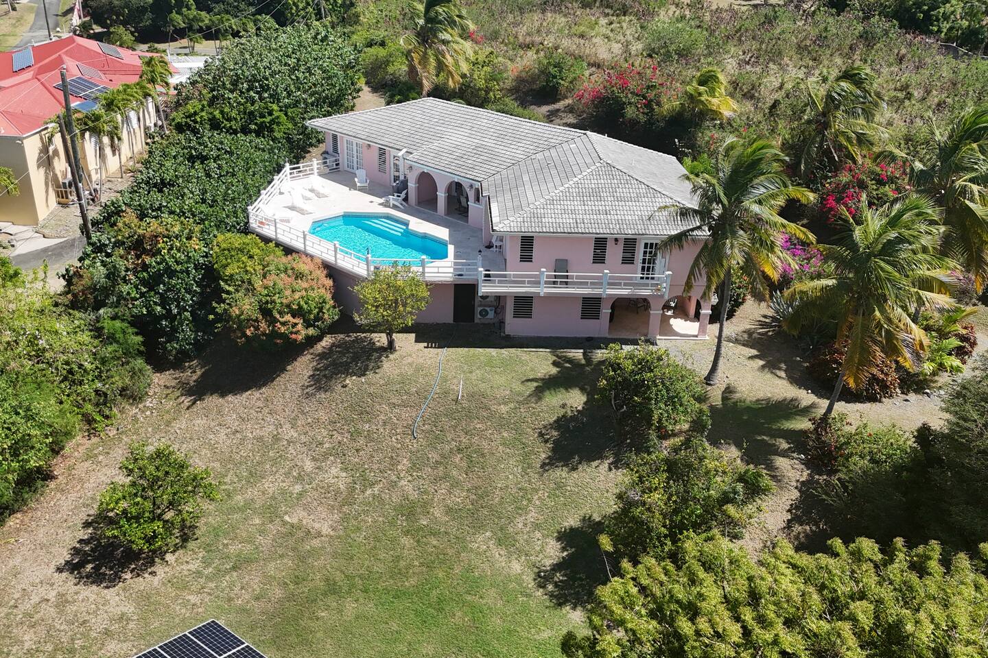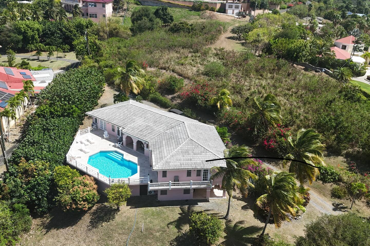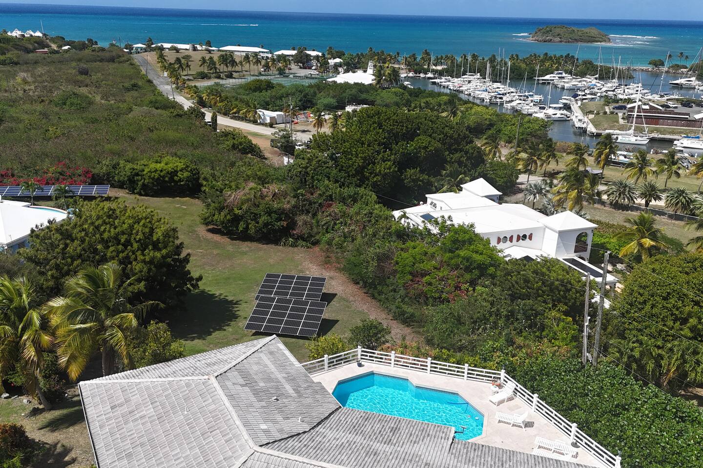 Beautiful private residence with 5 ensuite bedrooms (includes optional lower level apartment) entire house is fully air conditioned and all rooms have interior access. Magnificent views of Green Cay marina out to Buck Island. Well equipped for friends or families with small children. Located next to Buccaneer resort and golf course in gated Shoys Beach neighborhood with access to Shoys Beach. House is equipped with beach gear, gourmet kitchen, and remote office.