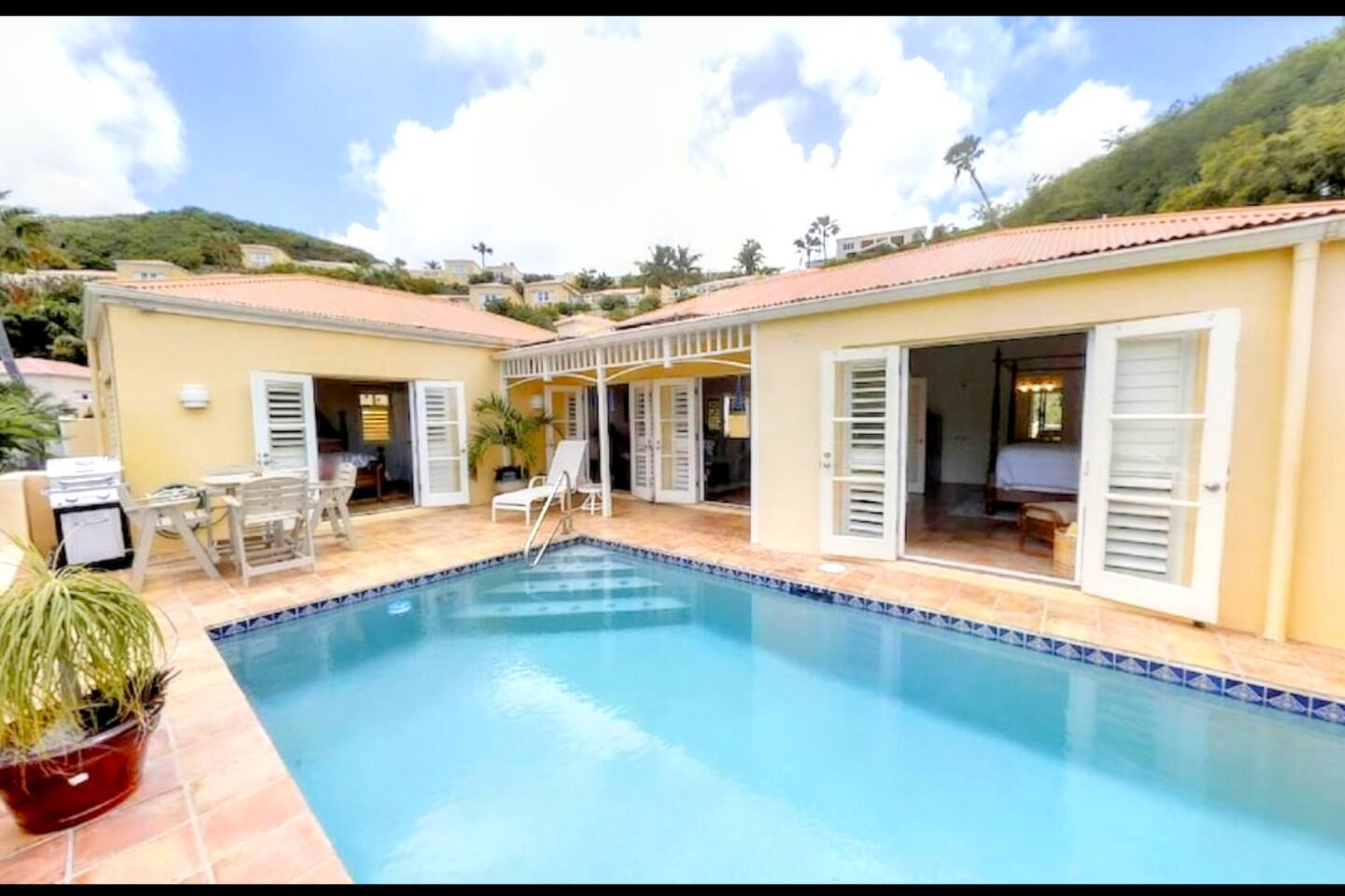 Welcome to Sanctuary 2.0. Located in the sought after Villa Madeleine complex, you will find this villa tucked in a beautiful manicured setting, with bright and vibrant tropical foliage to greet you as you approach. This villa boasts a cool, comfortable living room with high vaulted ceilings. Each bedroom has it's own ensuite. The patio area has a private pool and amazing views, and leads to the 2nd ensuite bedroom. Your own private tropical paradise awaits!