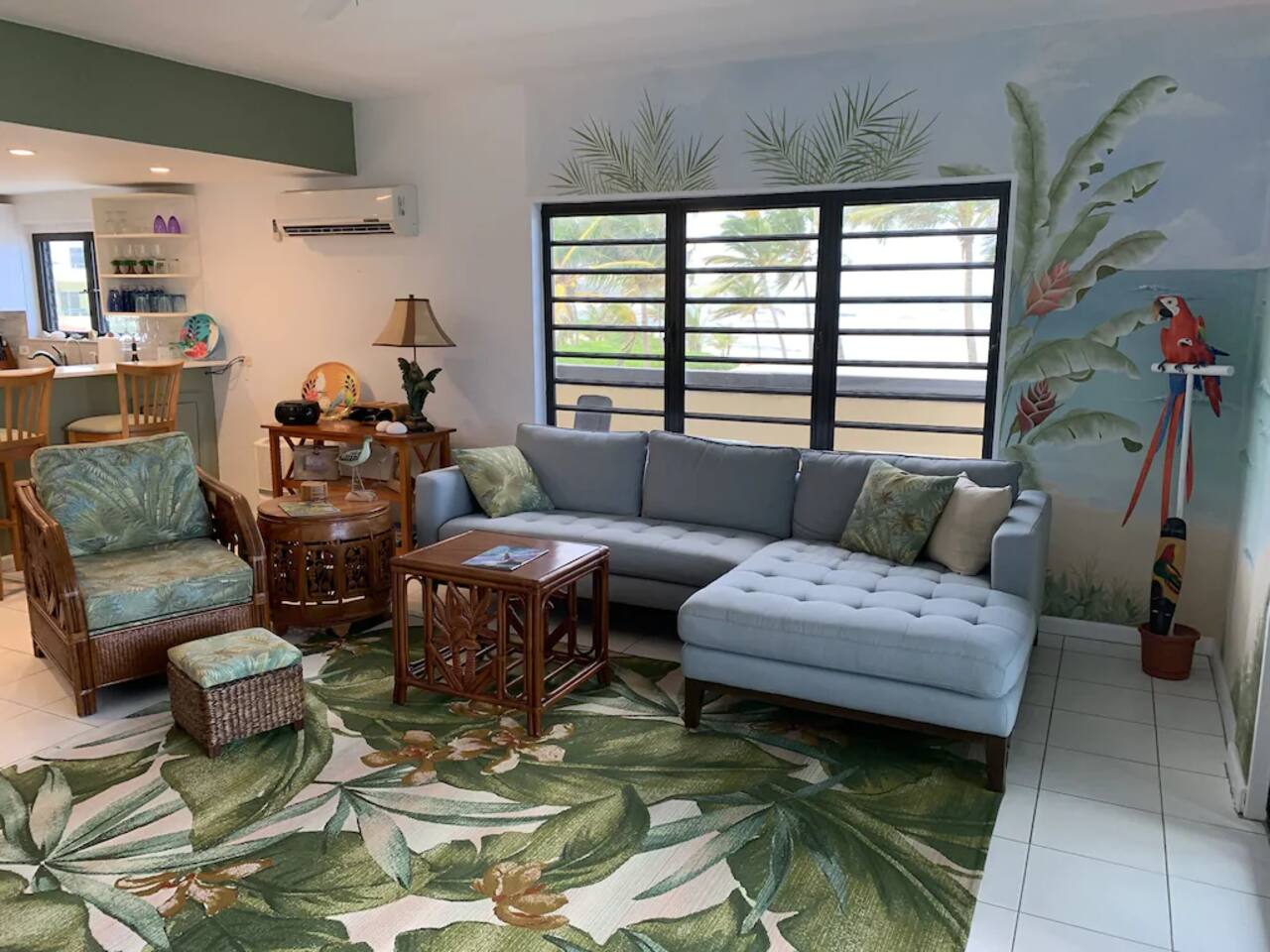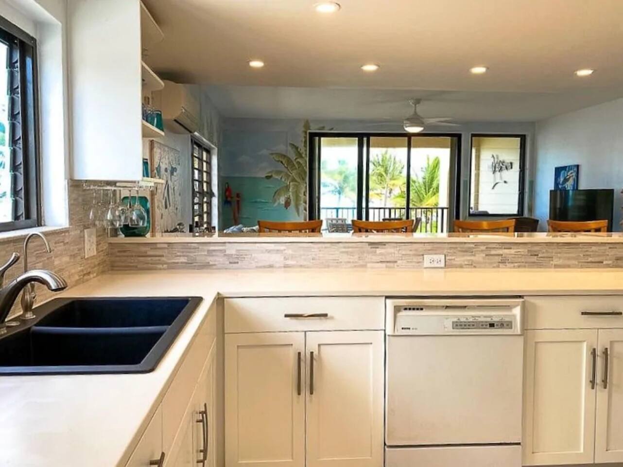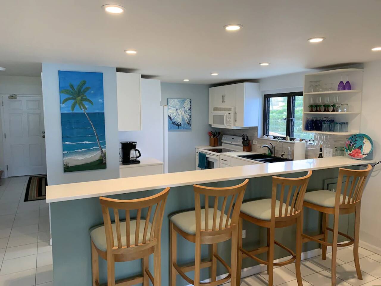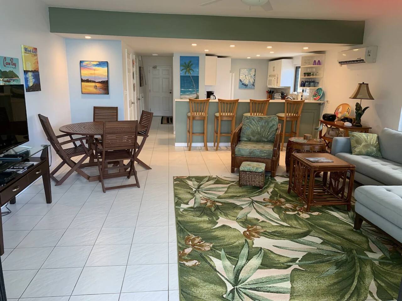 "Serenity by the Sea" is a lovely 1,360 square foot condo in the popular, gated community of Pelican Cove. This 2 bedroom, 2.5 bath end unit, which can comfortably sleep 6 people, offers stunning views of the Caribbean from every room. You are, literally, just steps away from the sea and, as you listen to the sound of the waves and feel the warm breeze off the water from the unit's two balconies, you will be delighted that you are here. On the main floor, the kitchen and living room are open concept. The updated kitchen is fully-appointed with a double-door refrigerator, range, microwave, dishwasher, and coffee bar. You can eat at the large kitchen counter, which has 4 stools, for a casual meal or dine at a table in the spacious living room. Through the living room sliding glass doors, you can relax on the balcony and enjoy the view of swaying palms and the beautiful Caribbean Sea. The main floor also provides an office with a full size murphy bed and a half bath. There are two ensuite bedrooms on the second floor. The master bedroom has a king size bed, ensuite bathroom, and a balcony to view the palm lined beach. The guest bedroom comes complete with a comfortable queen size bed and ensuite bathroom. The unit is equipped with linens, bath and beach towels, along with a washer and dryer. The unit features air-conditioning, wi-fi, and cable. Take a dip in the large swimming pool and enjoy the open-air hot tub. The grounds are always well maintained and you will enjoy the lush, tropical plants growing throughout the property. Since this unit is only 200 ft. from the white sand beach, it is stocked with a cooler, beach chairs, beach towels, and "noodles" for your use. If you just want to relax and not drive anywhere, The Palms resort is located right next door. It offers a great bar and restaurant which serves breakfast, lunch, and dinner daily, just steps away from the beach. They offer a delicious Sunday brunch, too. The Palms provides entertainment as well. There are endless options for recreation on St Croix. You can enjoy 3 national parks while you are here: Christiansted National Historic Site, where you can visit 7 historic buildings, and enjoy shopping and restaurants along the boardwalk; Buck Island Reef National Monument, where you can enjoy snorkeling, picnicking, and hiking; and Salt River National Historical Park and Ecological Preserve, where you can kayak and explore archeological sites. Christiansted is just a 10 minute drive from "Serenity by the Sea", and there are several restaurants and grocery stores nearby for your convenience. If you have any need for assistance, there is an on-call property manager available to you 24/7 during your stay. We hope you enjoy all this beautiful island has to offer!